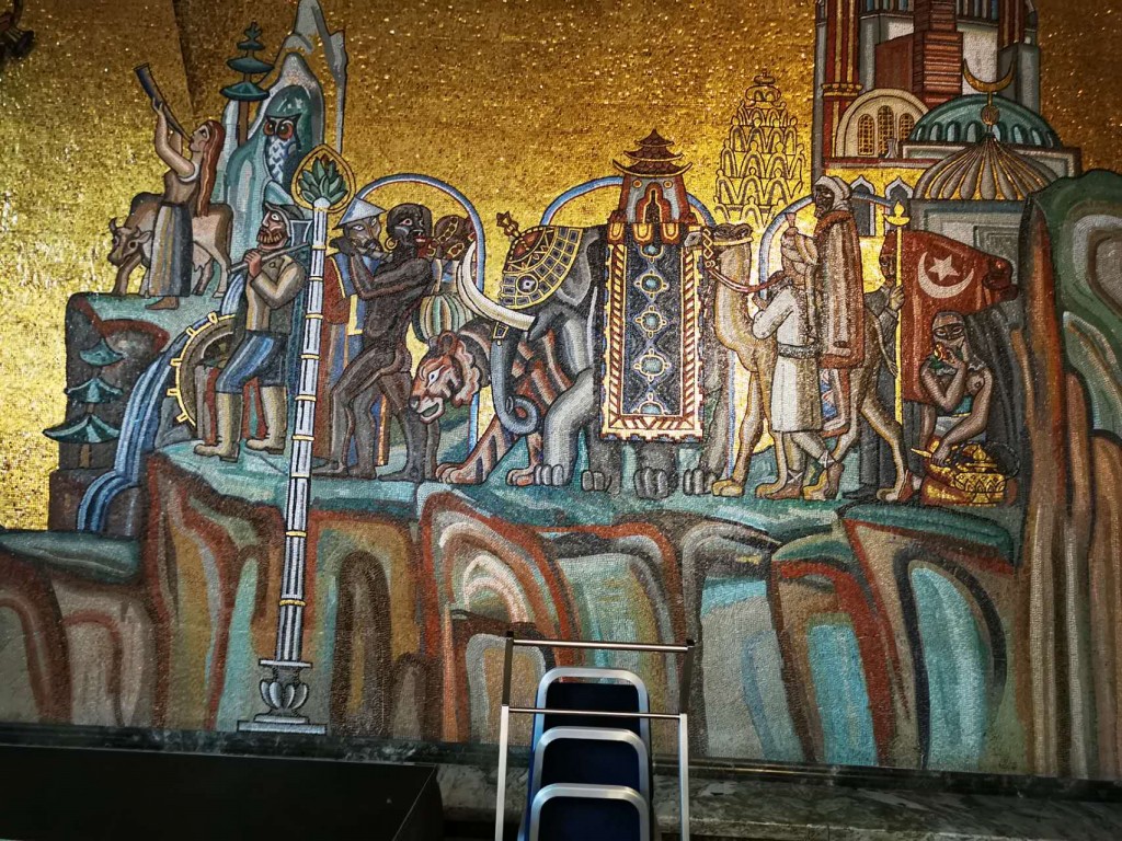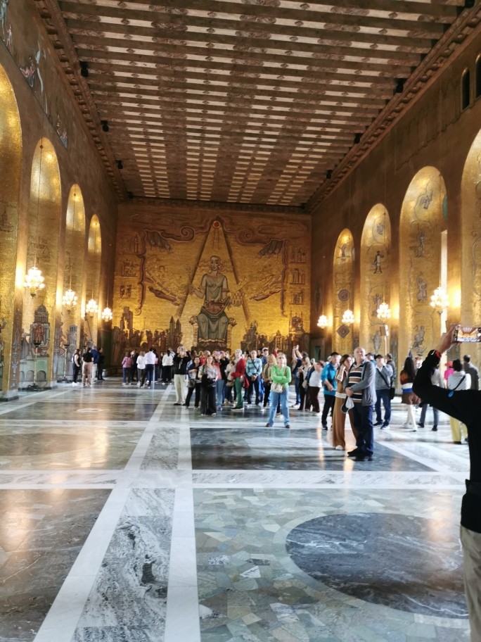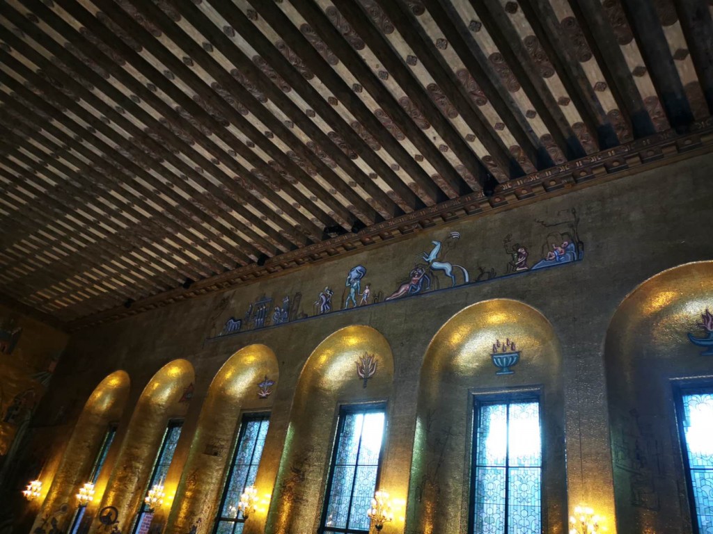 这都不仅是金色了,真是用金箔装修的。图案是北欧的民间神话传说,相当于瑞典的口述历史,完全不同于现代的宗教。