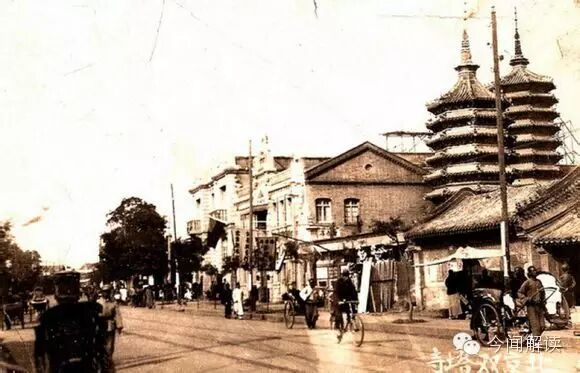 北京西长安街街景老照片。照片中右侧的双塔玲珑秀丽,相挽而立。这就是曾矗立在西长安街电报大楼位置的双塔庆寿寺。(网路图片)