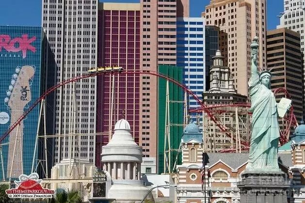 拉斯维加斯犹如一个巨大的影城,这里有各种微缩的世界名胜,包括金字塔和卡通版的曼哈顿。如果你想在几分钟之内不费脚程地看遍微型纽约景色,那么快快坐上New York-New York Roller Coaster!