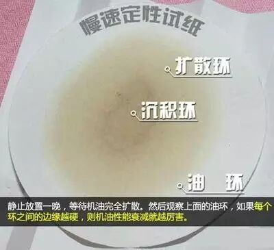 如果扩散的机油油环、沉淀环、扩散环之间的边缘越明显,说明机油性能衰减得厉害,应该更换了。