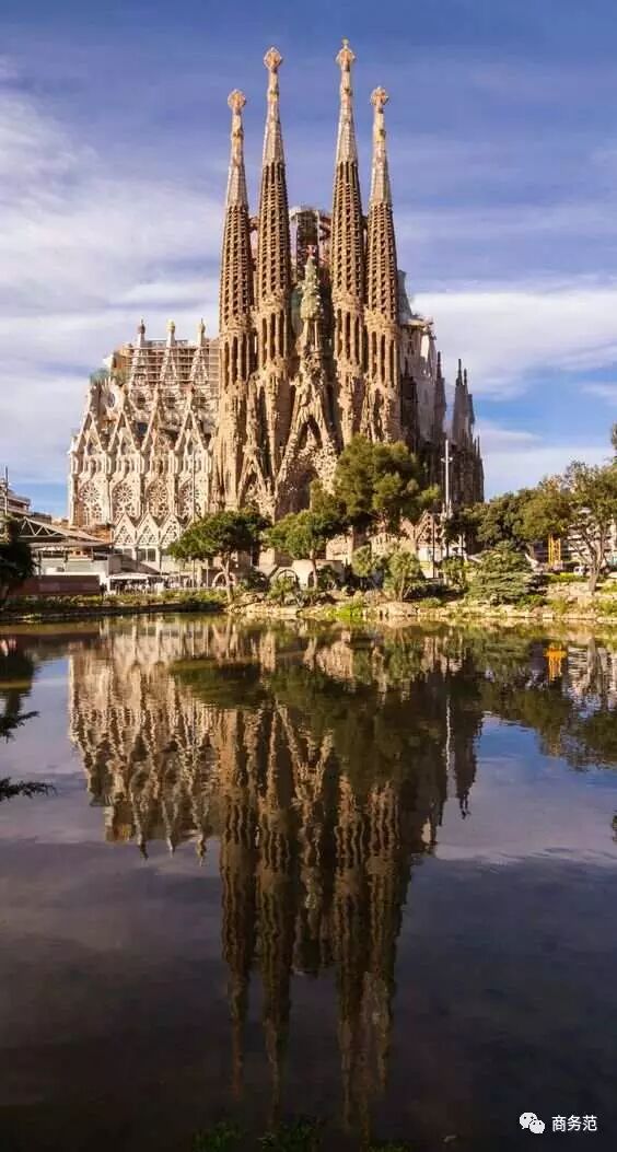 这是一座教堂,名为 Sagrada Familia,中文名圣家族大教堂,是罗马天主教教皇钦定的圣殿。高迪 1883 年的时候接手该建筑,一直主持设计 + 施工到 1926 年去世,高迪将自己的下半生几乎全都献给了这个建筑,但在他生前建筑只完成了大约 1/4,后来一直短短续续建到了 2010 年,刚完成高迪设计的工程量的一半。