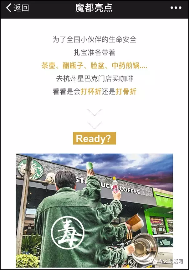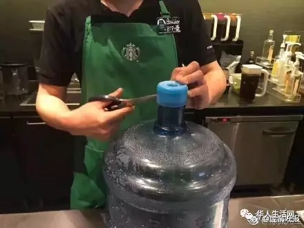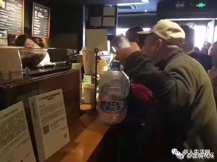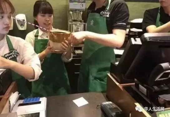 这组图是一个公众号4月17日做的测评。他们带着茶壶、醋瓶子、脸盆、中药煎锅去星巴克,看会不会真的有自带容器减3元的活动。