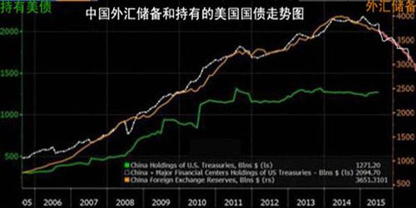 (图5:2005-2015年中国外汇储备和持有的美国国债走势图)