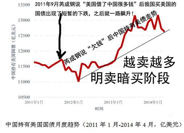 (图4:中国持有美国国债走势图。注意2011年9月芮成钢“欠钱”论引发网民对政府的强烈不满后,我国持有的美债的确出现了短暂的抛售,但从第二年就开始明卖暗买、“越卖越多”。傻子都会明白:如果真是美国欠中国那么多钱还不了,中国政府还会加倍地借钱给它?)