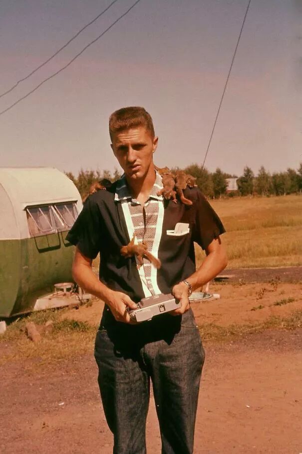 “1958年,我的爷爷刚剪了个帅气发型,身上的是他养的5只宠物松鼠”