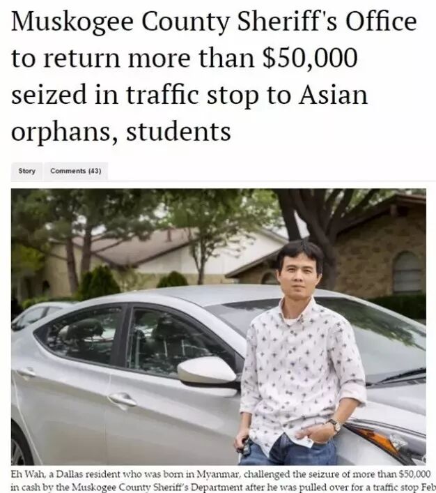 去年2月27日亚裔学生爱华,开车行经奥克拉荷马州,因为车后灯破损而被警察拦下。由于警犬有反应,便搜查华艾的车,结果查出5万3234美元现金,在路边盘问了一小时,后又带到警局盘问了近5小时,警方虽未找到毒品或走私品,最后没收这笔钱,人才放出,还不算,3月5日法院给出没收现金的通知,这没有完,4月5日又被控贩毒所得提出对其控诉。