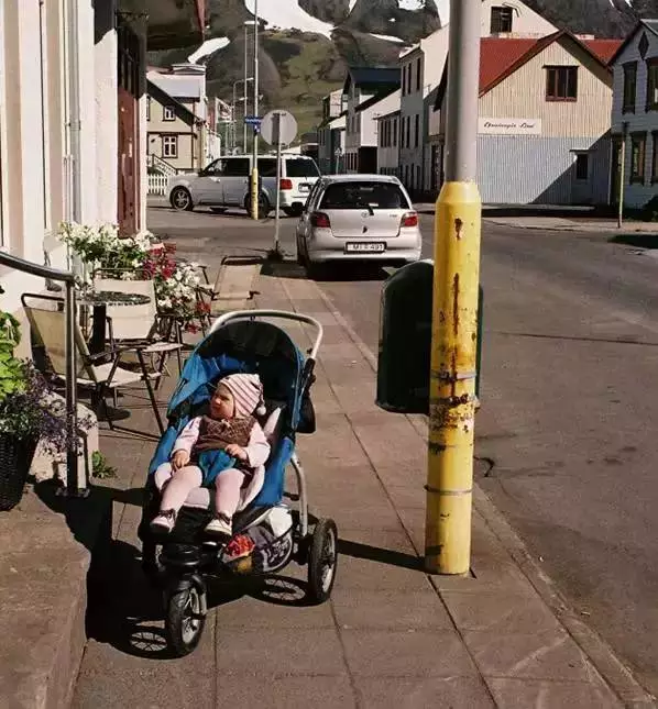 △冰岛的爹妈去吃饭逛街时,就把孩子放店外睡觉。