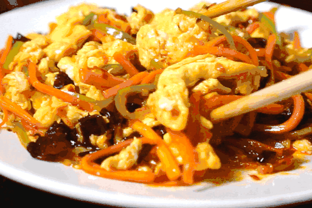 7. 放入蔬菜丝,大火翻炒2分钟左右,断生。