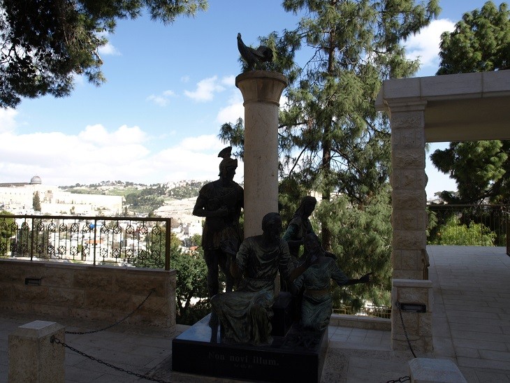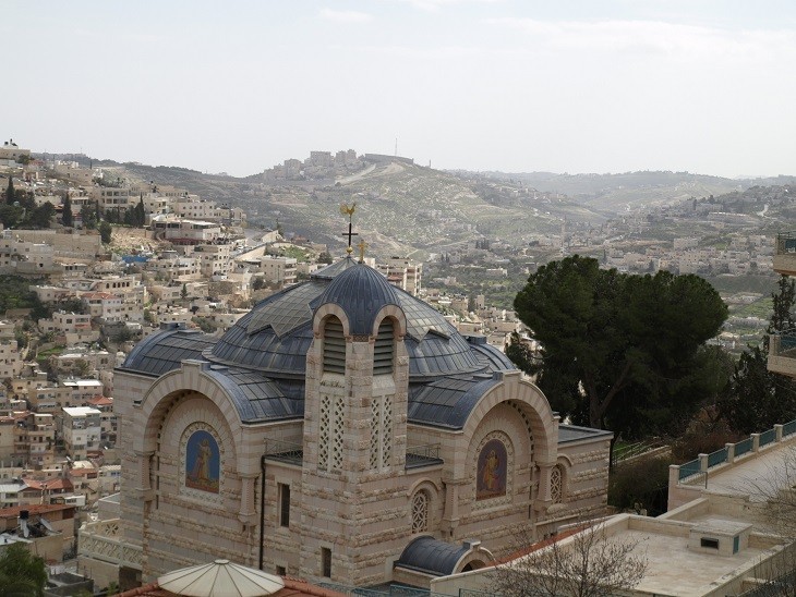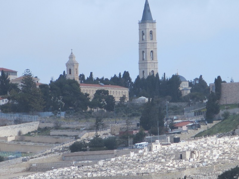 在参观鸡鸣堂之前,导游将我们领到一小块高地上,领略耶路撒冷的为“众山环绕”。