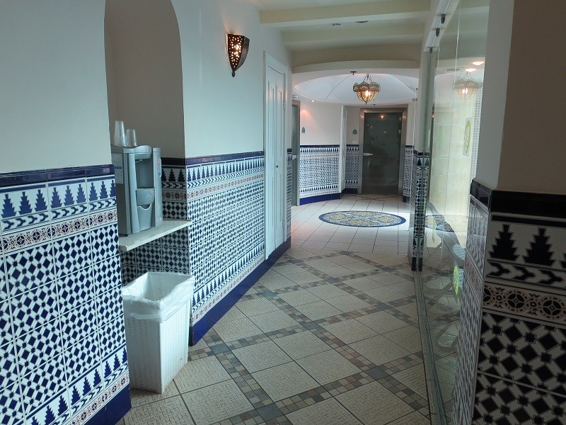这是通向泳池的过道,贴墙的瓷砖很是清雅。