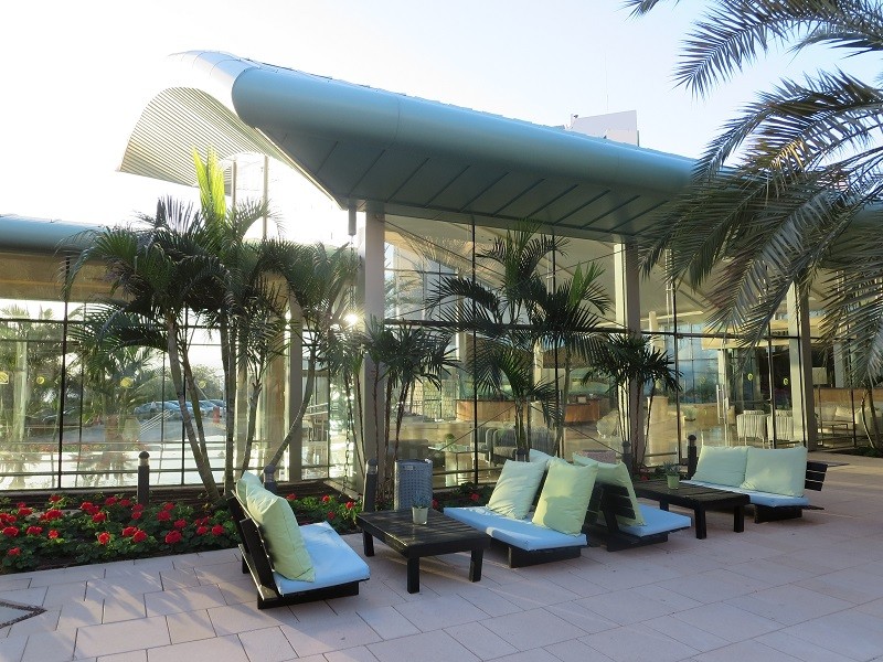 这间酒店的建筑还是很有特点的,前厅设计成一片叶子,客房在另一侧,成菱形排列,使大多的房间都能“面朝大海”。