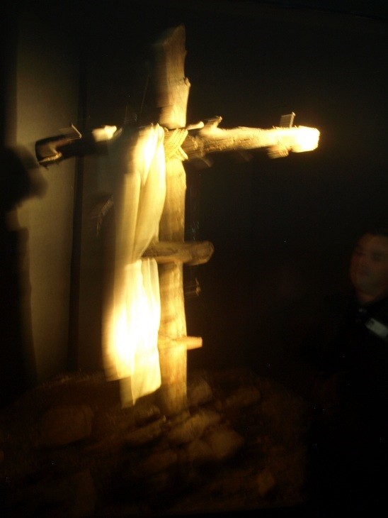 那上面还存留着锈迹斑斑的铁钉。真的无法想像人的肉体和这粗砺的木架钉在一处的痛苦。
