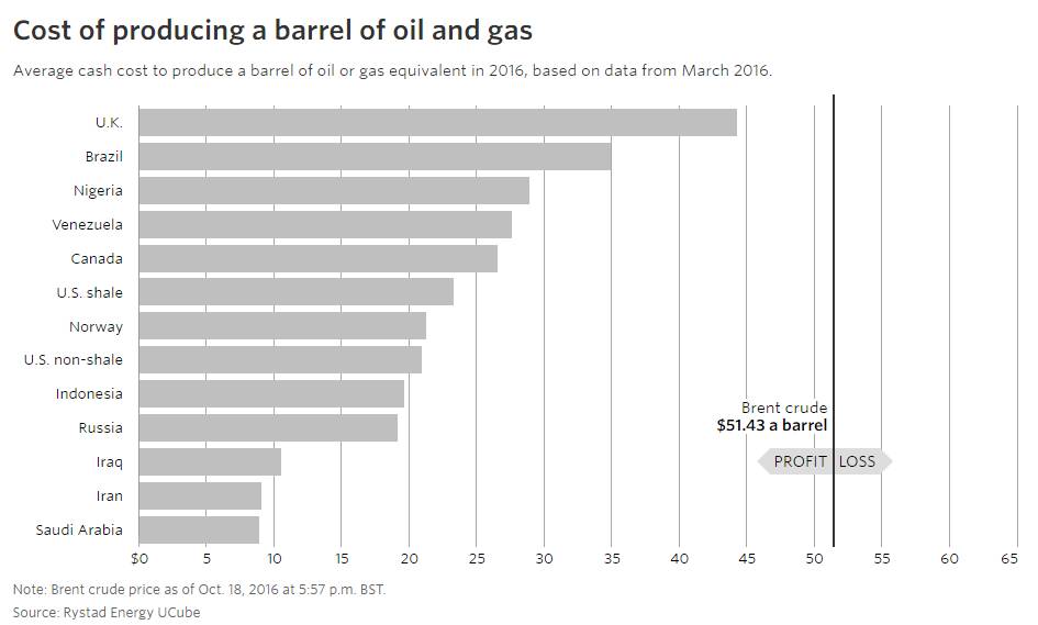 其次是石油。以2016年4月发布的数据,石油目前全球现金生产成本平均约在$51.43/桶。其中沙特阿拉伯,伊朗和俄罗斯的生产成本最低。平均为$9,$10, $20左右.因为成本每个国家不同,所以欧佩克内部总是有没完没了关于减产的争吵。没人愿意少赚,每个国家都有自己的小算盘,但美国的页岩油的成本约在$60左右. 所以一旦油价进入$50-60,就会有页岩油公司投入生产,沙特和美国页岩油之间的缠斗远未结束。而且一旦川总当选,重企业利润轻环保概念的共和党有可能推动境内石油开采,从而使油价进一步承压。