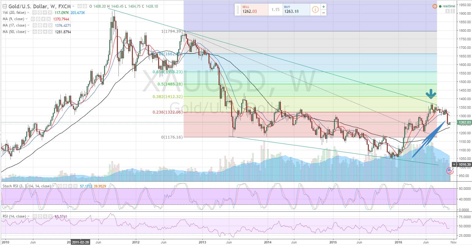 对于2016年底美元加息的期待在逐步走强,通常和黄金反向走势的美元,通过加息会有可能会进一步压制金价。黄金$1400关键阻力尚未触及,2016年10月3日的大幅度下跌先让金价彻底跌入中期50天均线(50MA)以下似乎预示了本轮反弹的终结,至少,让投资人看清了黄金的高风险高波动性不是适合每一个投资人。