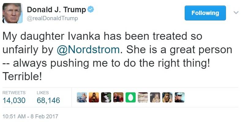 “我女儿Ivanka被不公平的对待!“川大爷在Twitter愤怒地回应美国知名连锁百货Norstrom下架他女儿的同名品牌。