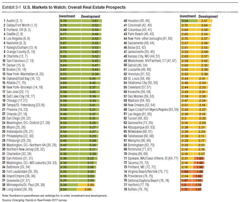 随着价格成本的走高,收益在不断地下降。地产几年来的收益让炒作的氛围更为浓厚,我现在微信朋友圈里的地产投资大师几年间增加了3倍,形势一片大好。全美似乎都有不错投资的机会,但职业商业地产投资人认可以下地区(见图7,投资/开发),衡量标准是区域经济发展速度或在物流链的所处位置等诸如此类,没提朋友圈。