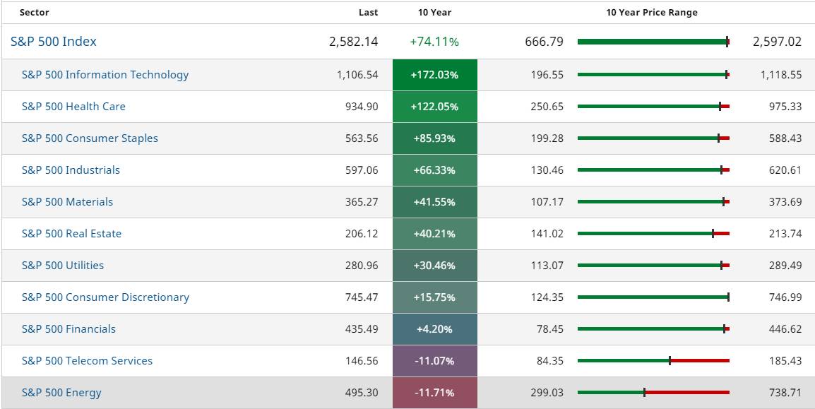 2017对投资人启示最多的莫过于高科技和比特币。Google的阿法狗横扫中韩顶级棋手,随后推出的自学成才的阿法狗零(AlphaZero)在不借助人类数据帮助情况下40天就已超越旧版。机器不用人自己可以单飞了。这一点对我的冲击甚至超过了中年危机。高盛(GoldmanSachs)的大厅交易员已从上百位剩下现在的孤单两人和一众无语的机器同事。交易快的连办公室政治都没了。大机构运用人工智能投资已成趋势,现在难以把握的是这种变化对于被动投资和主动投资的影响。指数型的被动投资不陌生,但第一只AI主导的主动ETF今年已正式上路了,完全基于数据运算选股投资,滤除了人为因素,无恐惧无贪婪。罗伯特.席勒( Robert Shiller )对人为因素在投资中的关联性影响已有阐述,只是遗憾这只AI操盘的ETF上市时间还短,尚无法印证机器的杀伤力有多大。相比AI,整体科技板块的回报表现也很亮眼。10年平均回报达到172% (见图3)。