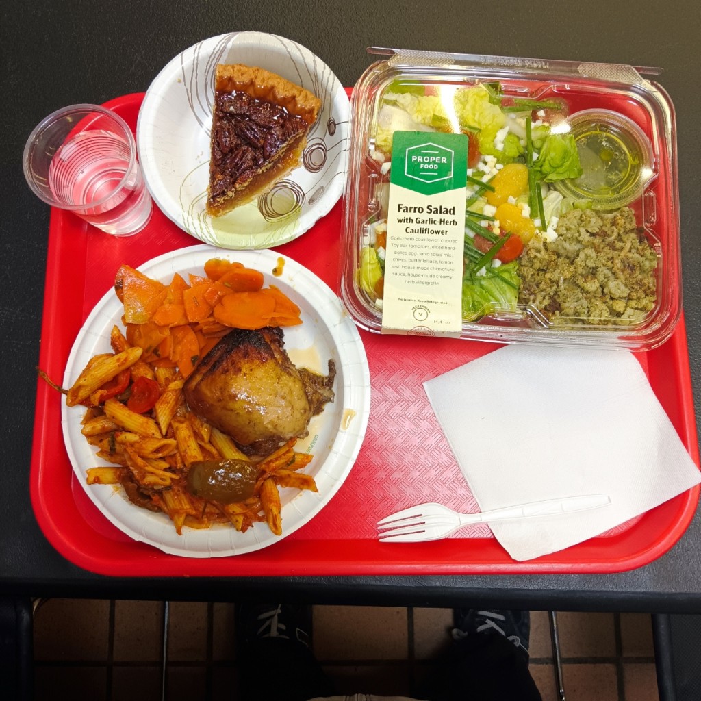 一盒沙拉,我还没吃,留到夜间再吃。透过包装盒,见里面有烤椰菜花,烤西红柿,煮熟的麦粒,和生的生菜叶,还放了少许生的中式小葱段。