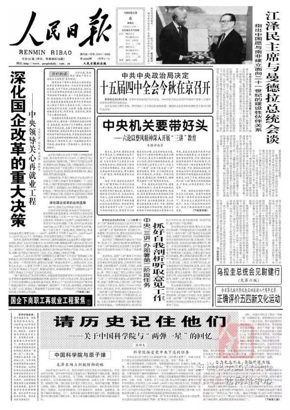 1999年5月6日,《人民日报》第1版刊发了张劲夫的文章《请历史记住他们——关于中国科学院与“两弹一星”的回忆》。