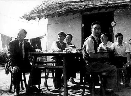 这张照片是在上海南汇一座农舍前拍摄的,钱学森与中国科学院副院长张劲夫等几位同行者坐在那里休息,桌子上放着糕点,钱学森的身后还晾晒着农户的衣服。