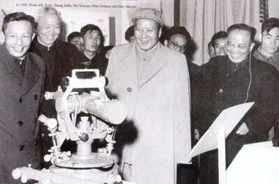 1958年,毛泽东主席参观中国科学院科研成就展。前排左起为:张劲夫、吴有训、毛泽东、郭沫若。
