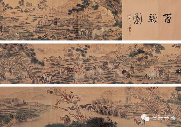 清代是中国宫廷绘画的顶峰,来自意大利的传奇画家郎世宁,则是清代宫廷绘画领袖,正是在他中西合璧绘画技法的影响下,才形成了别具一格的清代宫廷画风。郎氏善画马,《百骏图》是其平生百余幅马作品中的杰作。此图描绘了姿态各异的骏马百匹放牧游息的场面。全卷色彩浓丽,构图复杂,风格独特,别具意趣。
