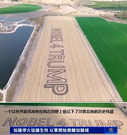 川普总统在过去的两个月了,经过他的努力已经平熄七场战争。其中有几场是积怨久远,持续了几十的难以解决的纠纷。就这七场战争被川普扑熄了,已经是功德无量了。川普已经可以名垂史册了。且不论川普的其他的作为,就无可非议的,足以成为历史上,史无前例的伟大人物了。 (图:一个以色列农民用拖拉机在田野上铭记下了川普总统的历史丰功伟绩)