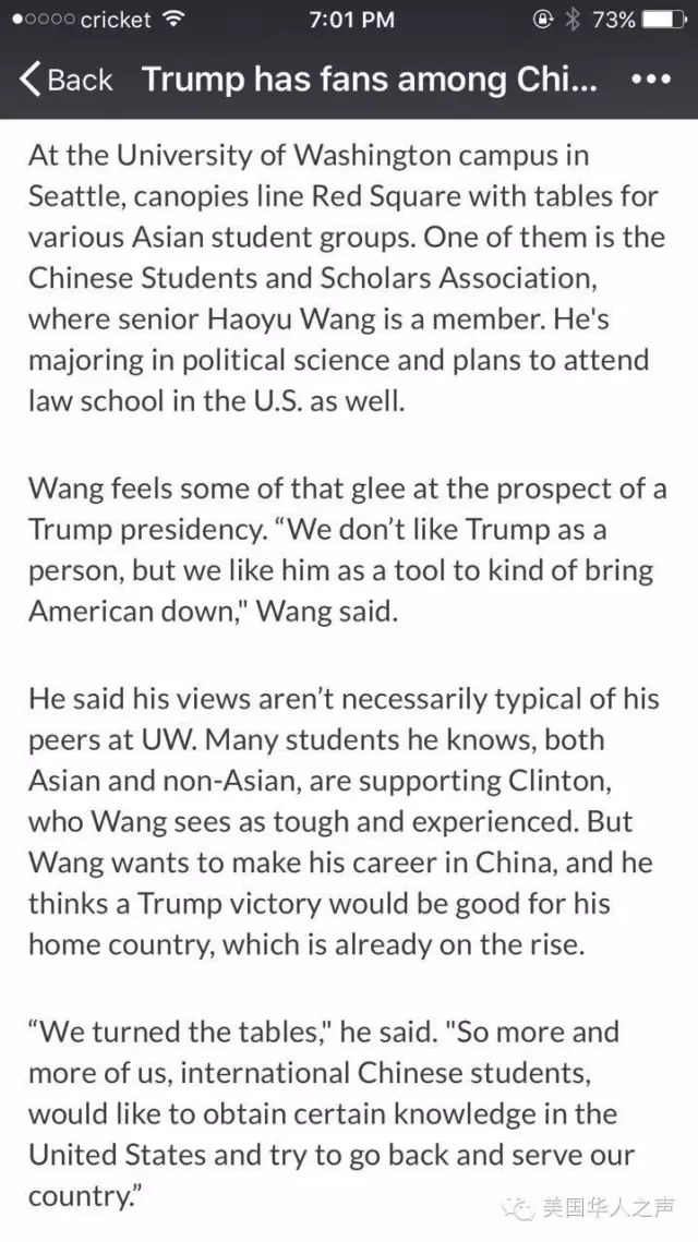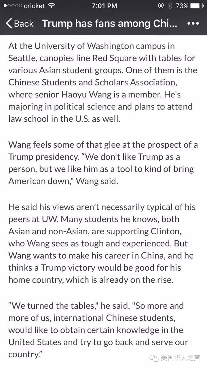 据当地华人调查了一下这位Haoyu Wang应该是在西雅图校区UW,他自称学political science政治学,其实是学本科英语的,还在学英语的F1同学就请不要掺和本届大选了。他到美国时间短,不了解美国比较复杂的政治环境,另外,他个人背景有些复杂,还带有大量中国政治的烙印。这些都可以理解,但是,NPR偏偏选这么一个连投票权都没有的奇葩来代表在美华人解读挺川广告,其用意就居心叵测了。