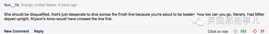 “米勒应该被取消冠军资格,她只是发现对手马上就要超过她了,没有办法才直接扑向终点,这也太low了吧,如果把米勒的躯干立起来,那明显是菲利克斯的躯干先到达的终点线”