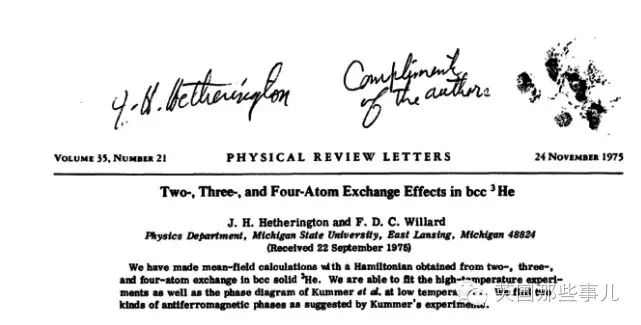 1975年,Hetherington是密歇根州立大学的物理教授。当时他写了一篇论文:Two-, Three-, and Four-Atom Exchange Effects in bcc 3He,