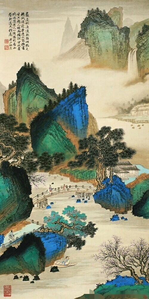 不管怎么说画中的情景和画面上的题跋有很大反差,我们先一个一个去解决,先看画面,这幅画用色很讲究,颜色的饱和度很高,看上去特别舒服,或者这就是画家要表达的意思,他一时一样给大家一个不一样的色彩世界。
