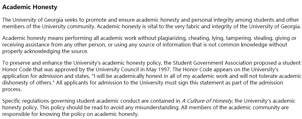 University of Georgia自建校以来一直积极提倡学术诚信的重要性。每一位在校的学生和教师都有责任和义务监督和确保学校的学术诚信和个人诚信。学术诚信意味着在做所有学术工作时,不得剽窃、欺骗、撒谎、篡改、窃取、给予或接受其他人的帮助或使用不认可的信息来源。