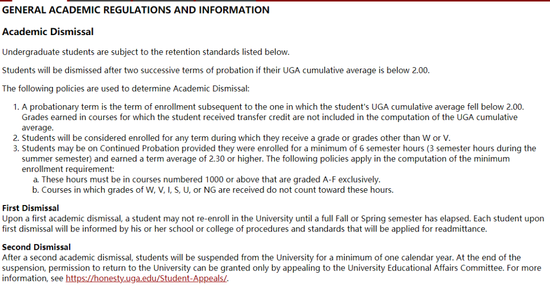 University of Georgia要求本科生的累积GPA要在2.0或以上。如果达不到最低的学术要求,学生会在学期结束后被留校察看(Scholastic Probation)。处于留校察看的学生,需要尽快提高自己的成绩到2.0或以上,以解除学术危机。如果学生连续第二个学期累积GPA依然低于2.0,则会被继续留校察看(Continued Probation)。处于继续留校察看的学生,必须在新的学期中注册至少6个学分的课程并取得2.3或以上的学期GPA才可以避免被开除。