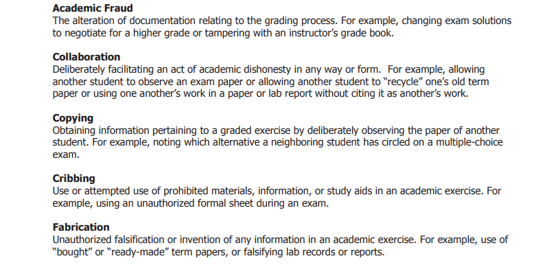 伦斯勒理工大学对学术不诚信的定义,包括不限于:学术欺诈、未经允许的合作、抄袭、使用未经允许的材料、伪造、剽窃、恶意破坏、代写代考(Academic Fraud、Collaboration、Copying、Cribbing、Fabrication、Plagiarism、Sabotage、Substitution)。