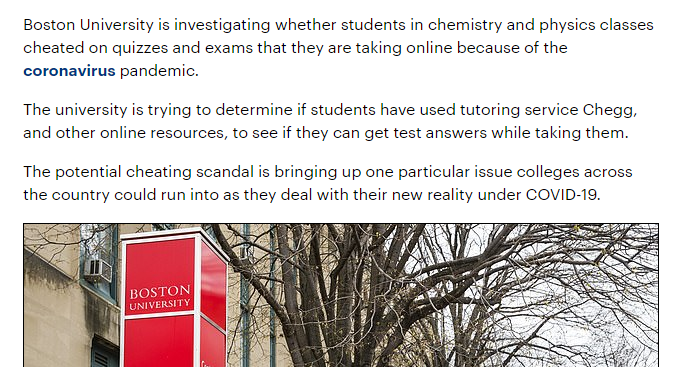 然后波士顿大学接着也上了新闻,说正在与Chegg网站调查上传考试答案以及使用这些答案的学生。随着疫情的爆发,学校转为网课后发现很多学生在网上进行的测验和考试中有作弊嫌疑。