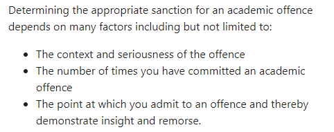 处罚的结果取决于学术不诚信行为的严重程度,学生的过往学术记录,以及学生的悔改态度。如情节较轻且为首次犯错,可能的处罚有警告,课业0分,课程挂科,停学不超过1年,以及记录入成绩档案等。如果情节严重或学生多次违反学术诚信,则会将案件上报至Tribunal。一旦上报,学校将展开正式的调查和听证会,学生也将面临更加严厉的处罚。除了上面提到的较为轻微的处罚,学生有可能被直接开除,取消已经授予的学位,甚至学生的行为会被公布在学校报纸上。