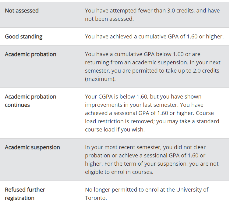 作为加拿大华人较多的大学之一,学校要求本科生必须满足一定的学术成绩才能顺利毕业。每个学期结束,学校都会对学生的成绩进行评估。本科生需要每个学期选修至少3个学分的课程,并达到最低GPA 1.6的要求,被视为学术良好。如果学生无法满足最低的学术要求,则会面临留校察看(Academic Probation)的处罚。