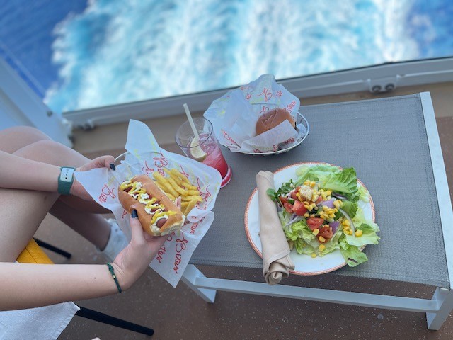 热狗汉堡,拿回阳台上吃的。要给二把手小费才愿意去拿。