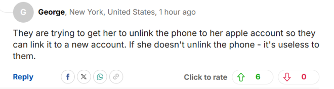 他们想让她把手机和苹果账户解除关联,这样他们就能把手机关联到新的账户。如果她不解除关联,手机对他们来说就毫无用处。