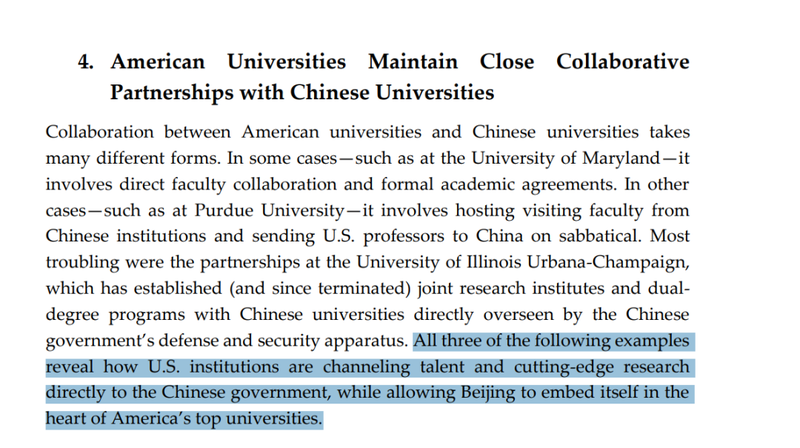 2025年9月发布的《From PhD to PLA》报告再次聚焦中美高校合作,指出联合学院、双学位等模式可能成为知识外流的风险通道,并点名了多所美国大学的案例。