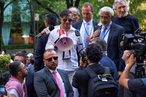 ▲哥伦比亚总统裴卓(白衣者)走上纽约(专题)街头加入一场声援巴勒斯坦的示威活动。