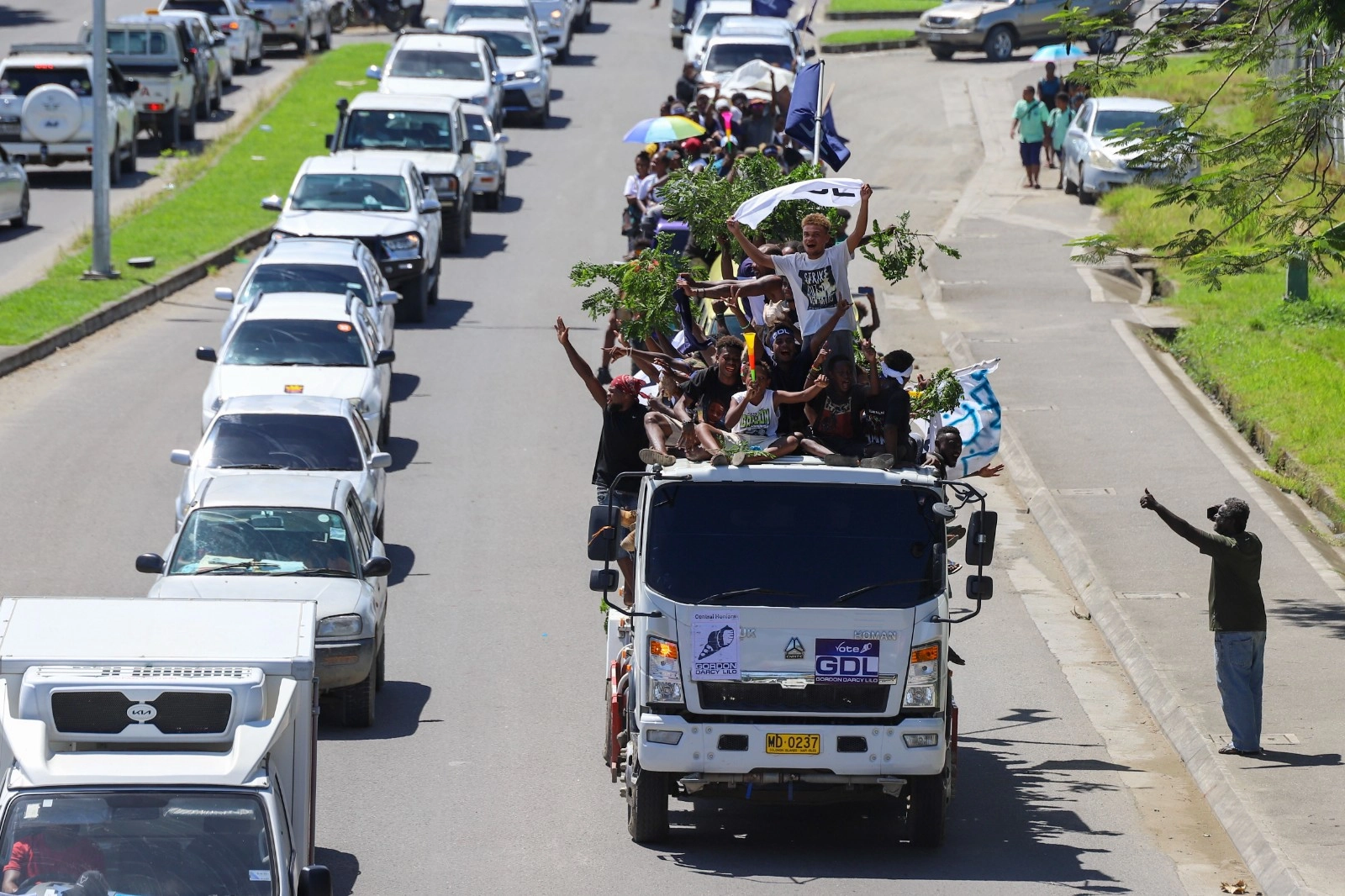 中国在所罗门群岛协助铺路,深得民心。 图为2024年4月15日首都民众在首都霍尼阿拉庆祝大选结果。 (美联社)