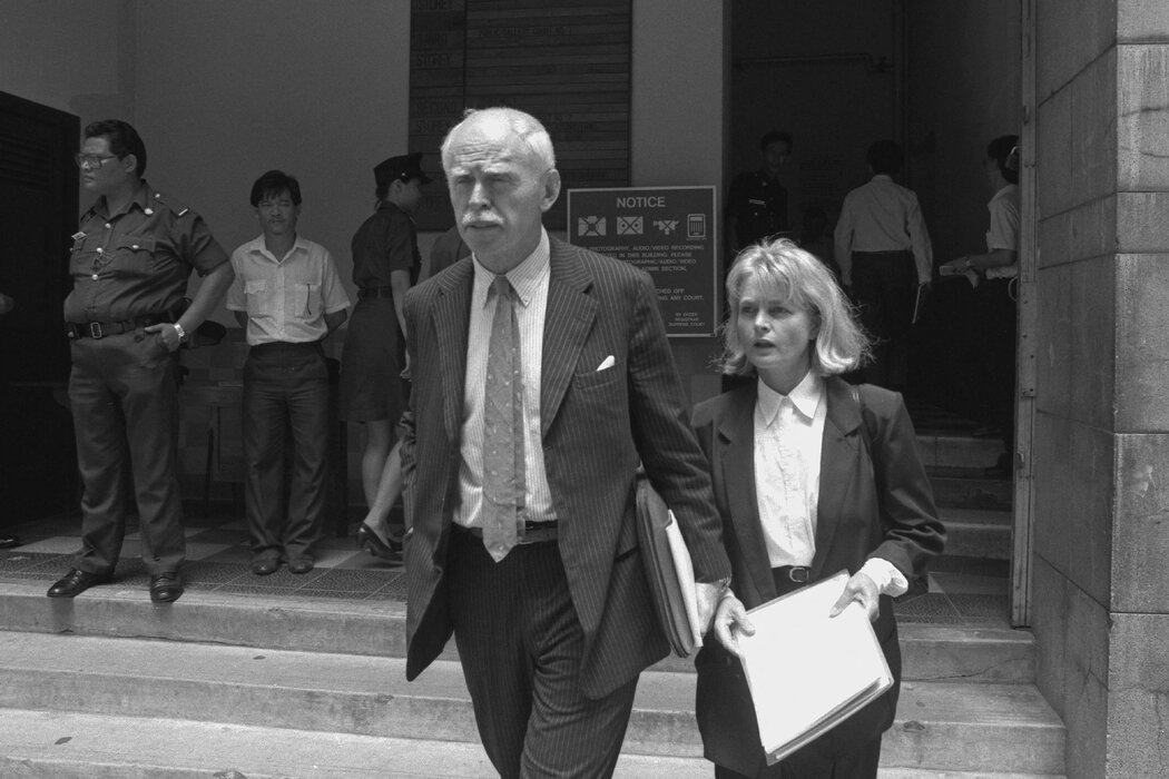 1988年,孔杰荣与国际法学家委员会的吉尔·斯普鲁斯走出新加坡一家法院。他们此前旁听了一宗政治案件的审理。 DOMINIC WONG/REUTERS