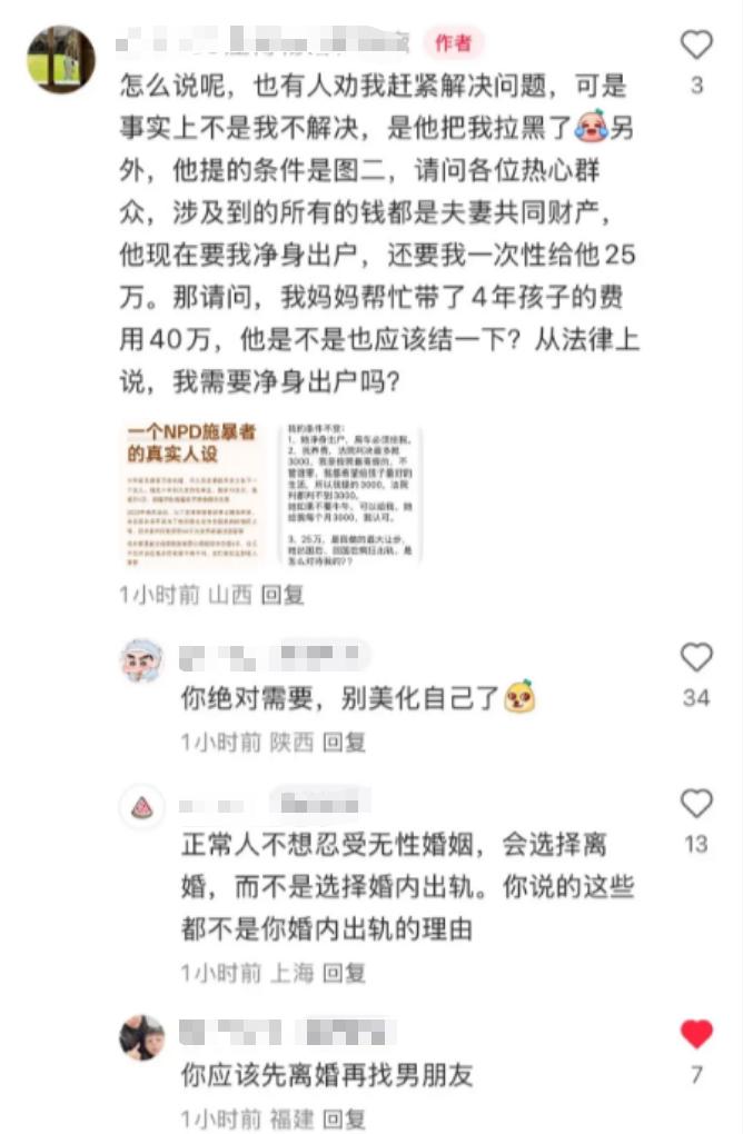 从王某发的动态可以看到,她竟然在网上公开寻求网友的意见。称丈夫要求她净身出户,还要她给25万赔偿金,她不同意,认为结婚后都是夫妻共同财产,询问网友是否需要净身出户。