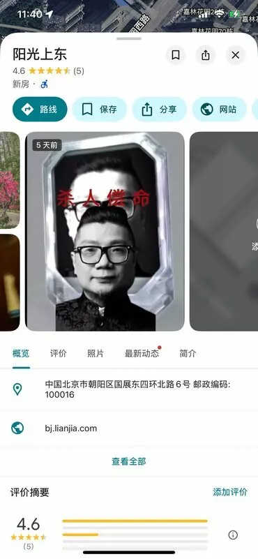 有网友将于朦胧坠楼事件的资讯上传至事发地点阳光上东社区的 Google 地图照片集中,试图进一步争取舆论的目光,并成功吸引了 Google 公司对相关事件的关注。 图: @xinwendiaocha X 帐号