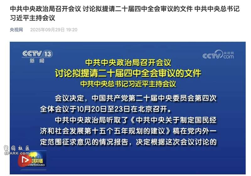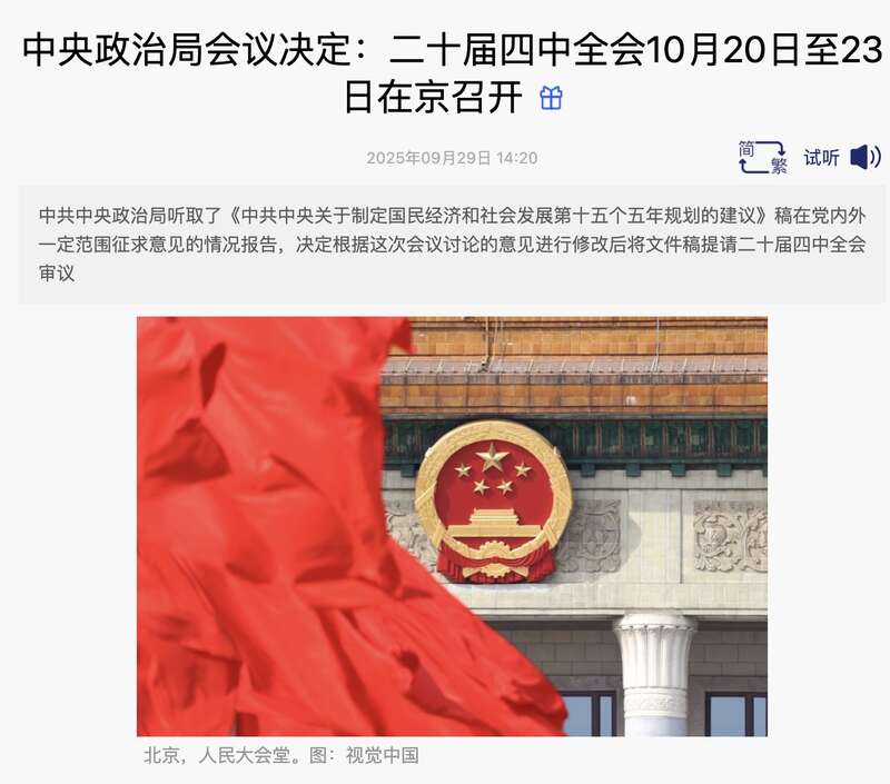 来源:倍可亲(backchina.com) 专题:香港最新动态!中共中央政治局周一召开会议决定,中共第二十届中央委员会第四次全体会议(四中全会)将于10月20日至23日在北京召开,并将在四中全会审议“十五五”(2026-2030年)规划建议;会议还研究了其他事项。
