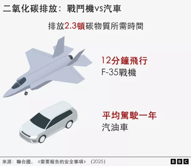 根据《自然》期刊于2022年发表的一项研究,美国空军的F-35战斗机每飞行100海里(约185公里)所排放的二氧化碳,相当于一辆英国普通汽油车一整年的排放量。