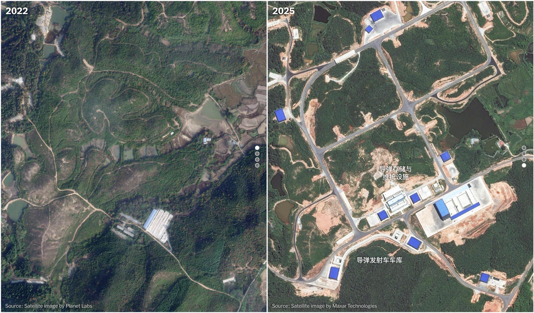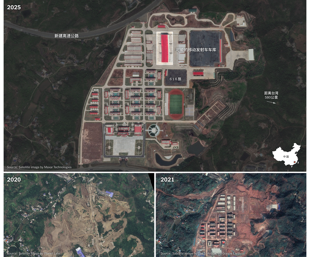 这是中国火箭军611旅基地。近年来,611旅基地的面积扩大了一倍,新建了发射台和用于模拟作战的假隧道。 SOURCE: SATELLITE IMAGE BY MAXAR TECHNOLOGIES