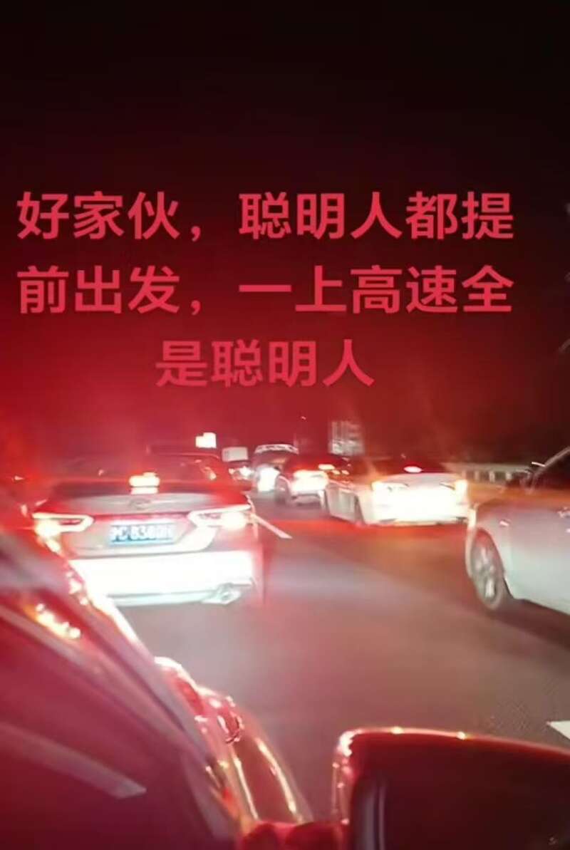 “聪明的人提前上高速了,结果发现高速上全是聪明人。”评论区有网友称,已经堵了两小时了,一动不动。