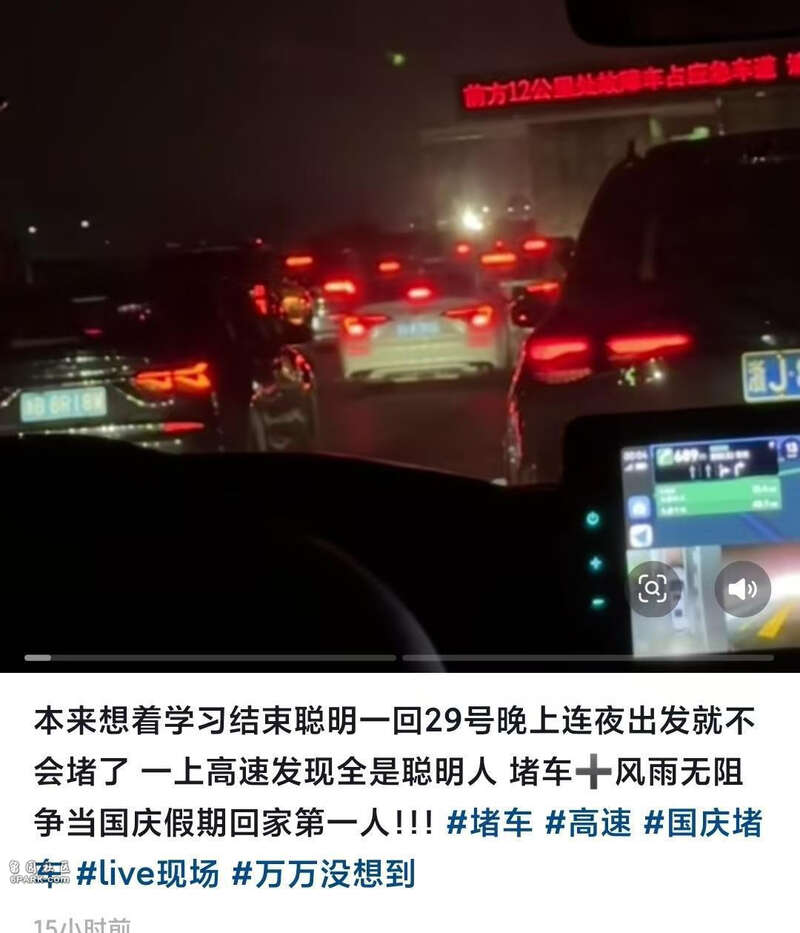 高速公路也堵车了。有网友去年在9月30日深夜出发,没想到路上有不少“大聪明”;今年提前了整整一天,还是遇到了大量“大聪明”。